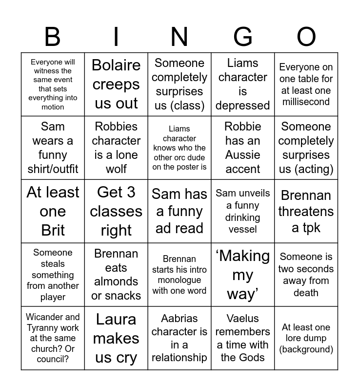 This bingo card has a free space and 24 words: Brennan eats almonds or snacks, Laura makes us cry, Liams character knows who the other orc dude on the poster is, Wicander and Tyranny work at the same church? Or council?, Everyone on one table for at least one millisecond, Everyone will witness the same event that sets everything into motion, Sam wears a funny shirt/outfit, Bolaire creeps us out, Sam unveils a funny drinking vessel, Brennan starts his intro monologue with one word, Robbie has an Aussie accent, At least one Brit, ‘Making my way’, Someone is two seconds away from death, Robbies character is a lone wolf, Vaelus remembers a time with the Gods, Brennan threatens a tpk, Someone completely surprises us (class), Someone completely surprises us (acting), Get 3 classes right, At least one lore dump (background), Someone steals something from another player, Liams character is depressed and Aabrias character is in a relationship.