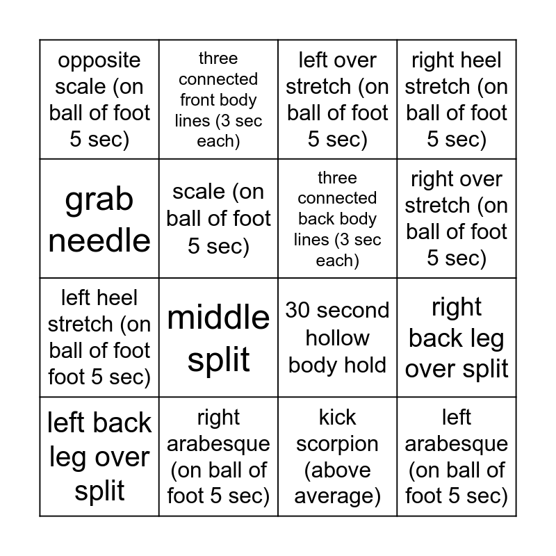This bingo card has 16 words: right arabesque (on ball of foot 5 sec), right back leg over split, left over stretch (on ball of foot 5 sec), opposite scale (on ball of foot 5 sec), left heel stretch (on ball of foot foot 5 sec), three connected front body lines (3 sec each), 30 second hollow body hold, kick scorpion (above average), grab needle, scale (on ball of foot 5 sec), left back leg over split, right heel stretch (on ball of foot 5 sec), middle split, right over stretch (on ball of foot 5 sec), three connected back body lines (3 sec each) and left arabesque (on ball of foot 5 sec).