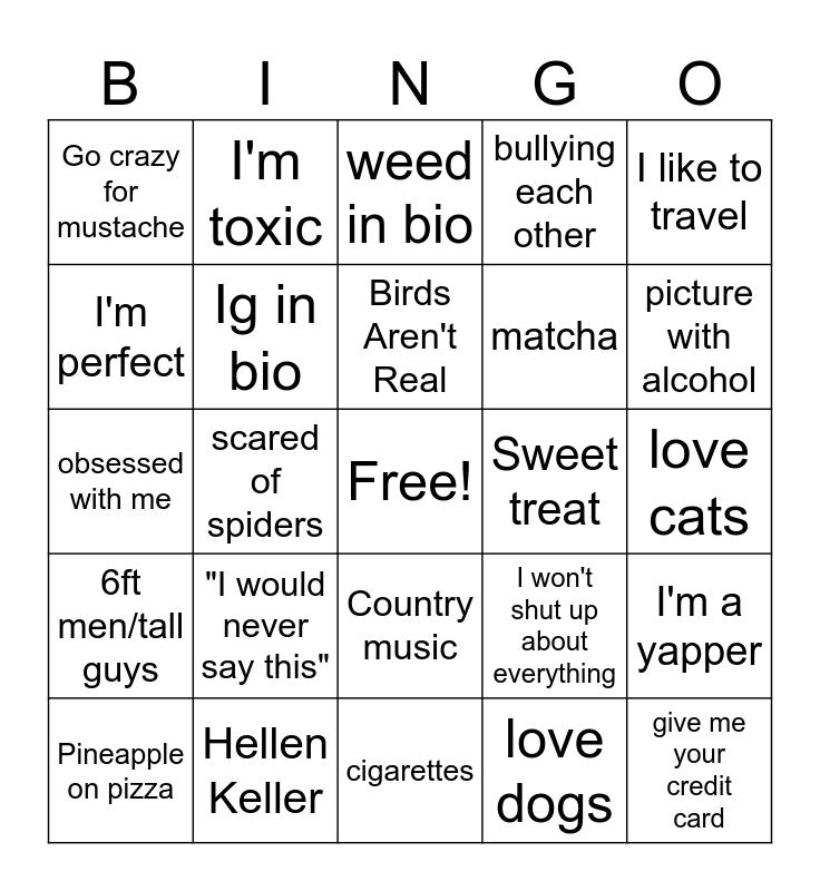 This bingo card has a free space and 24 words: "I would never say this", Hellen Keller, Birds Aren't Real, Pineapple on pizza, I like to travel, Go crazy for mustache, I'm perfect, I'm toxic, Sweet treat, Country music, matcha, obsessed with me, I won't shut up about everything, I'm a yapper, Ig in bio, love dogs, love cats, weed in bio, picture with alcohol, scared of spiders, give me your credit card, 6ft men/tall guys, bullying each other and cigarettes.