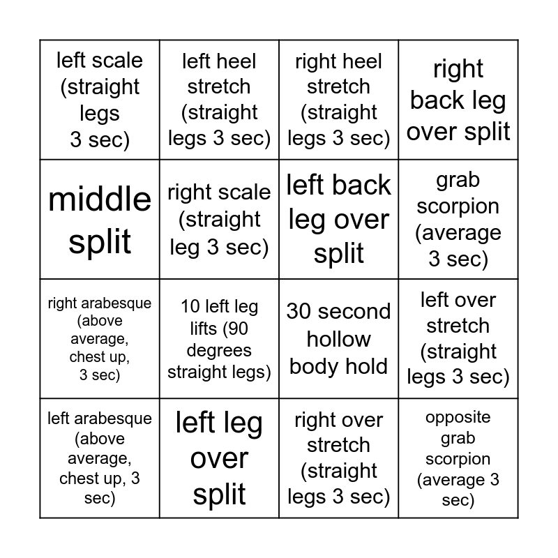 This bingo card has 16 words: left leg over split, left over stretch (straight legs 3 sec), right heel stretch (straight legs 3 sec), left scale (straight legs 3 sec), right arabesque (above average, chest up, 3 sec), left heel stretch (straight legs 3 sec), 30 second hollow body hold, right over stretch (straight legs 3 sec), middle split, right scale (straight leg 3 sec), left arabesque (above average, chest up, 3 sec), right back leg over split, 10 left leg lifts (90 degrees straight legs), grab scorpion (average 3 sec), left back leg over split and opposite grab scorpion (average 3 sec).