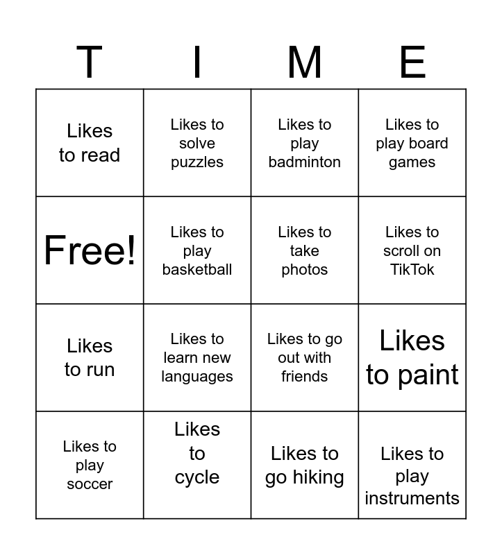This bingo card has 16 words: Likes to cycle, Likes to paint, Likes to play badminton, Likes to read, Likes to run, Likes to solve puzzles, Likes to go out with friends, Likes to go hiking, Free!, Likes to play basketball, Likes to play soccer, Likes to play board games, Likes to learn new languages, Likes to scroll on TikTok, Likes to take photos and Likes to play instruments.