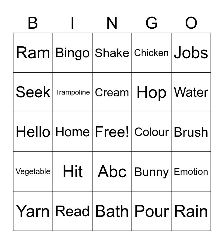 This bingo card has a free space and 59 words: Toy, Read, Shape, Vegetable, Pour, South, Trampoline, Silly, Hop, Sheep, Chicken, Plane, Seek, Weather, Animal, Ram, Rain, Jobs, Lick, Cream, Colour, Shake, Yarn, Emotion, Show, Teach, Queen, Monkey, Water, Car, Boo, Snack, Mirror, Cow, Bingo, Wake, Rainbow, Home, Potty, Hello, Piano, Hit, Brush, Sing, Bus, Unicorn, Listen, Dance, Abc, Bath, Garden, Spider, Shark, Hat, Look, Bunny, Duck, Fly and Orange.