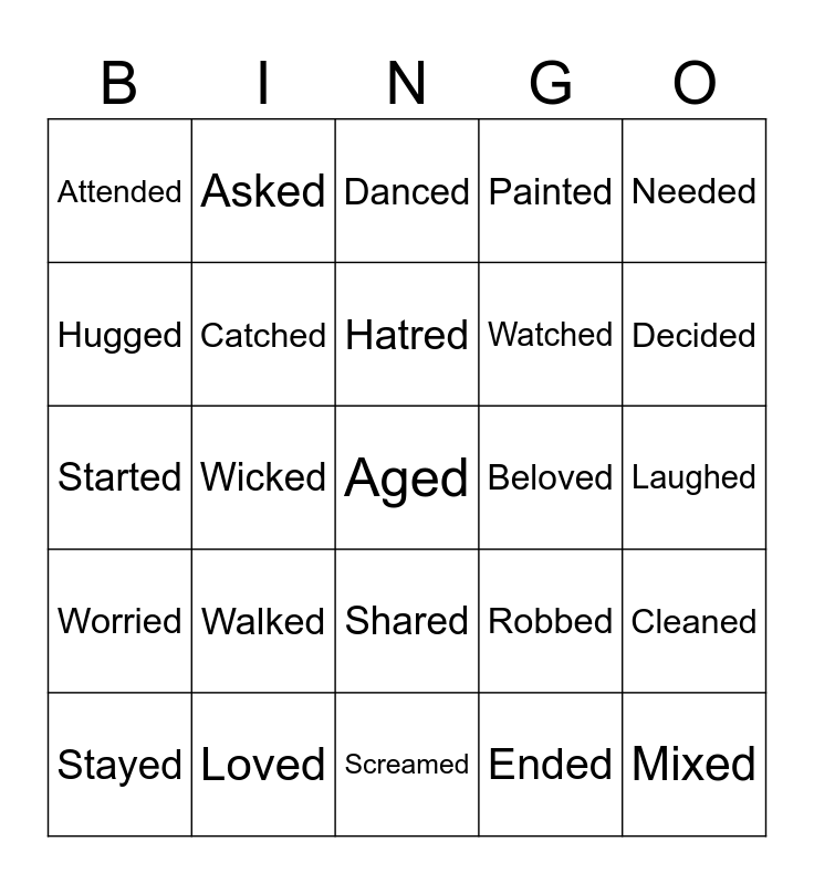 This bingo card has a free space and 24 words: Walked, Loved, Hatred, Stayed, Needed, Attended, Hugged, Asked, Beloved, Shared, Watched, Started, Robbed, Cleaned, Catched, Ended, Laughed, Danced, Decided, Wicked, Mixed, Worried, Painted and Screamed.
