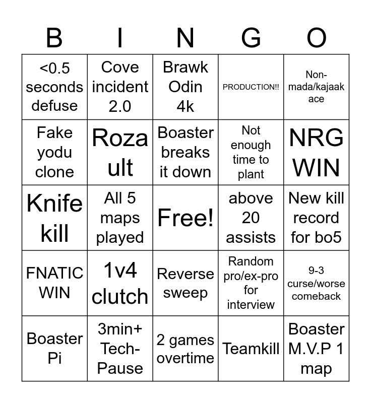 This bingo card has a free space and 24 words: Boaster Pi, 1v4 clutch, Boaster breaks it down, Teamkill, Non-mada/kajaak ace, <0.5 seconds defuse, Cove incident 2.0, Brawk Odin 4k, above 20 assists, New kill record for bo5, Knife kill, Roza ult, Random pro/ex-pro for interview, 9-3 curse/worse comeback, Fake yodu clone, 3min+ Tech-Pause, 2 games overtime, PRODUCTION!!, NRG WIN, FNATIC WIN, All 5 maps played, Reverse sweep, Not enough time to plant and Boaster M.V.P 1 map.