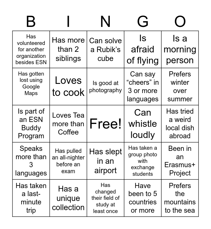 This bingo card has a free space and 32 words: Have been to 5 countries or more, Plays a musical instrument, Loves Tea more than Coffee, Has a driving licence, Speaks more than 3 languages, Loves to cook, Is a morning person, Been in an Erasmus+ Project, Has more than 2 siblings, Got lost in a new city, Is good at photography, Can solve a Rubik’s cube, Has a personal volunteering goal this year, Have met a celebrity, Can whistle loudly, Has hosted an international student, Has taken a last-minute trip, Is part of an ESN Buddy Program, Has slept in an airport, Has pulled an all-nighter before an exam, Has taken a group photo with exchange students, Knows at least 3 people from different ESN sections, Has tried a weird local dish abroad, Has a unique collection, Prefers the mountains to the sea, Is afraid of flying, Can say “cheers” in 3 or more languages, Has gotten lost using Google Maps, Has volunteered for another organization besides ESN, Has changed their field of study at least once, Has fallen asleep during a lecture and Prefers winter over summer.