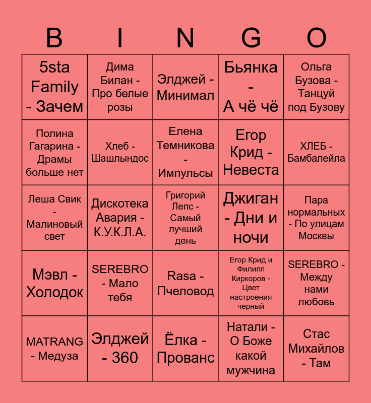 This bingo card has a free space and 24 words: SEREBRO - Мало тебя, Элджей - 360, Елена Темникова - Импульсы, MATRANG - Медуза, Ольга Бузова - Танцуй под Бузову, 5sta Family - Зачем, Полина Гагарина - Драмы больше нет, Дима Билан - Про белые розы, Джиган - Дни и ночи, Rasa - Пчеловод, Егор Крид - Невеста, Леша Свик - Малиновый свет, Егор Крид и Филипп Киркоров - Цвет настроения черный, SEREBRO - Между нами любовь, Хлеб - Шашлындос, Натали - О Боже какой мужчина, Пара нормальных - По улицам Москвы, Элджей - Минимал, ХЛЕБ - Бамбалейла, Дискотека Авария - К.У.К.Л.А., Стас Михайлов - Там, Мэвл - Холодок, Бьянка - А чё чё and Ёлка - Прованс.