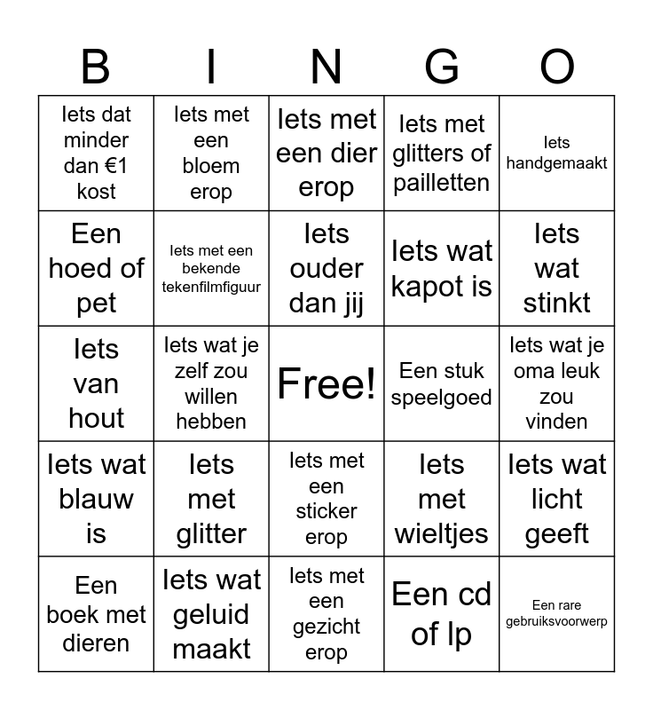 This bingo card has a free space and 24 words: Iets met glitter, Iets wat geluid maakt, Iets ouder dan jij, Een boek met dieren, Iets handgemaakt, Iets dat minder dan €1 kost, Een hoed of pet, Iets met een bloem erop, Een stuk speelgoed, Iets met een sticker erop, Iets wat kapot is, Iets van hout, Iets met wieltjes, Iets wat licht geeft, Iets met een bekende tekenfilmfiguur, Een cd of lp, Iets wat je oma leuk zou vinden, Iets met een dier erop, Iets wat stinkt, Iets wat je zelf zou willen hebben, Een rare gebruiksvoorwerp, Iets wat blauw is, Iets met glitters of pailletten and Iets met een gezicht erop.