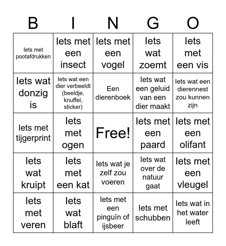 This bingo card has a free space and 24 words: Iets met een kat, Iets wat blaft, Een dierenboek, Iets met veren, Iets met een vis, Iets met pootafdrukken, Iets wat donzig is, Iets met een insect, Iets met een paard, Iets wat je zelf zou voeren, Iets wat een geluid van een dier maakt, Iets met tijgerprint, Iets wat over de natuur gaat, Iets met een vleugel, Iets wat een dier verbeeldt (beeldje, knuffel, sticker), Iets met schubben, Iets met een olifant, Iets met een vogel, Iets wat een dierennest zou kunnen zijn, Iets met ogen, Iets wat in het water leeft, Iets wat kruipt, Iets wat zoemt and Iets met een pinguïn of ijsbeer.