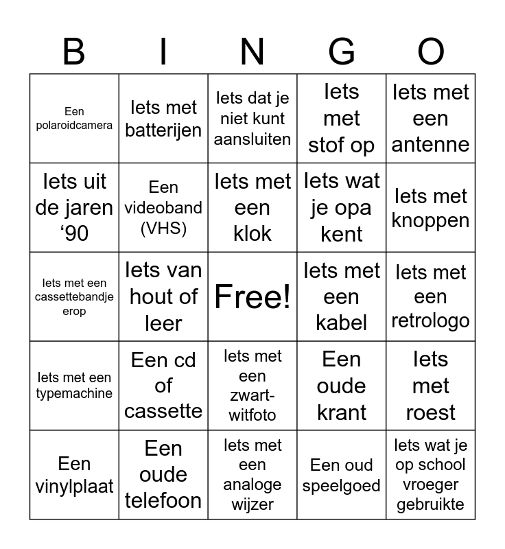 This bingo card has a free space and 24 words: Een cd of cassette, Een oude telefoon, Iets met een klok, Een vinylplaat, Iets met een antenne, Een polaroidcamera, Iets uit de jaren ‘90, Iets met batterijen, Iets met een kabel, Iets met een zwart-witfoto, Iets wat je opa kent, Iets met een cassettebandje erop, Een oude krant, Iets met roest, Een videoband (VHS), Een oud speelgoed, Iets met een retrologo, Iets dat je niet kunt aansluiten, Iets met knoppen, Iets van hout of leer, Iets wat je op school vroeger gebruikte, Iets met een typemachine, Iets met stof op and Iets met een analoge wijzer.