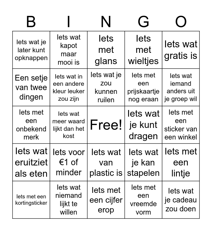 This bingo card has a free space and 24 words: Iets voor €1 of minder, Iets wat niemand lijkt te willen, Iets wat je zou kunnen ruilen, Iets met een kortingsticker, Iets wat gratis is, Iets wat je later kunt opknappen, Een setje van twee dingen, Iets wat kapot maar mooi is, Iets wat je kunt dragen, Iets wat van plastic is, Iets met een prijskaartje nog eraan, Iets met een onbekend merk, Iets wat je kan stapelen, Iets met een lintje, Iets wat in een andere kleur leuker zou zijn, Iets met een vreemde vorm, Iets met een sticker van een winkel, Iets met glans, Iets wat iemand anders uit je groep wil, Iets wat meer waard lijkt dan het kost, Iets wat je cadeau zou doen, Iets wat eruitziet als eten, Iets met wieltjes and Iets met een cijfer erop.
