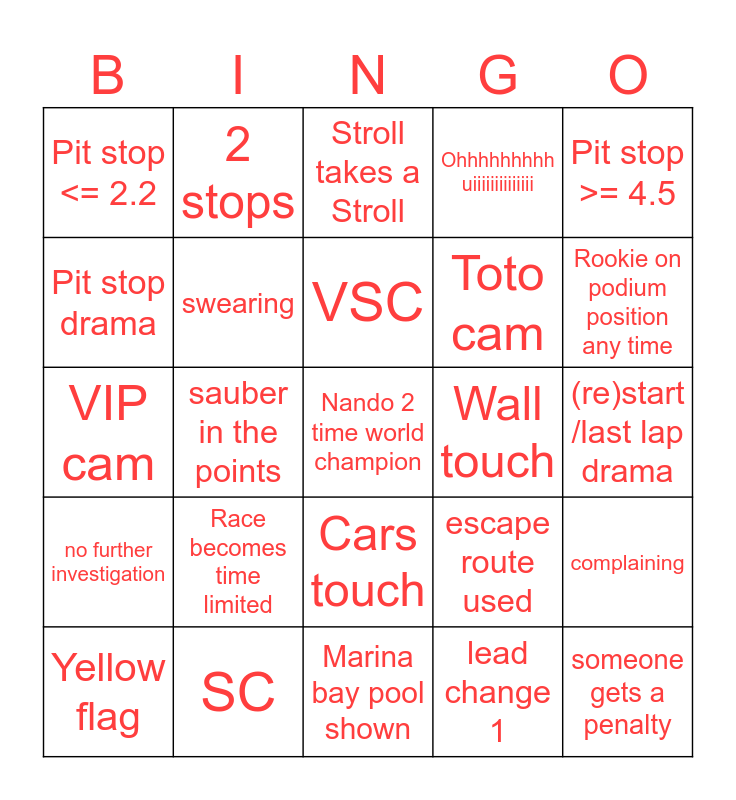 This bingo card has a free space and 24 words: Race becomes time limited, SC, VSC, Yellow flag, Pit stop >= 4.5, Pit stop <= 2.2, Pit stop drama, 2 stops, Wall touch, Cars touch, Toto cam, VIP cam, escape route used, complaining, swearing, lead change 1, (re)start /last lap drama, Stroll takes a Stroll, Rookie on podium position any time, sauber in the points, someone gets a penalty, no further investigation, Ohhhhhhhhh uiiiiiiiiiiiiii and Marina bay pool shown.