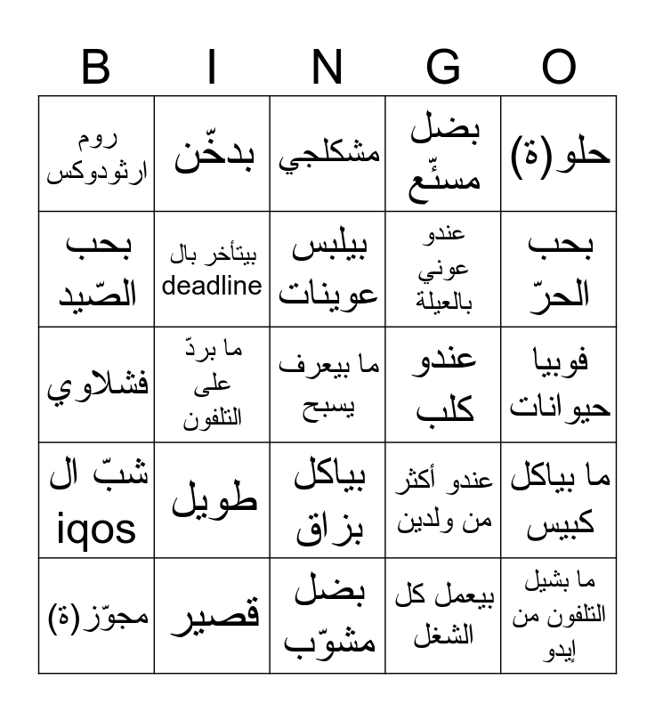 This bingo card has a free space and 24 words: طويل, قصير, بيلبس عوينات, (ة)مجوّز, حلو(ة), روم ارثودوكس, بحب الصّيد, بدخّن, عندو كلب, بياكل بزاق, عندو عوني بالعيلة, فشلاوي, عندو أكثر من ولدين, ما بياكل كبيس, بيتأخر بال deadline, بيعمل كل الشغل, فوبيا حيوانات, مشكلجي, بحب الحرّ, ما بردّ على التلفون, ما بشيل التلفون من إيدو, شبّ ال iqos, بضل مسئّع and بضل مشوّب.