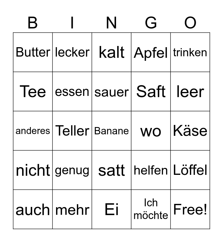 This bingo card has 34 words: Free!, Ich möchte, mit, bitte, nicht, essen, trinken, auch, lecker, süß, sauer, kalt, heiß, danke, wo, leer, mehr, anderes, genug, helfen, satt, Brot, Butter, Käse, Ei, Banane, Apfel, Milch, Saft, Tee, Tisch, Teller, Löffel and Guten Appetit!.
