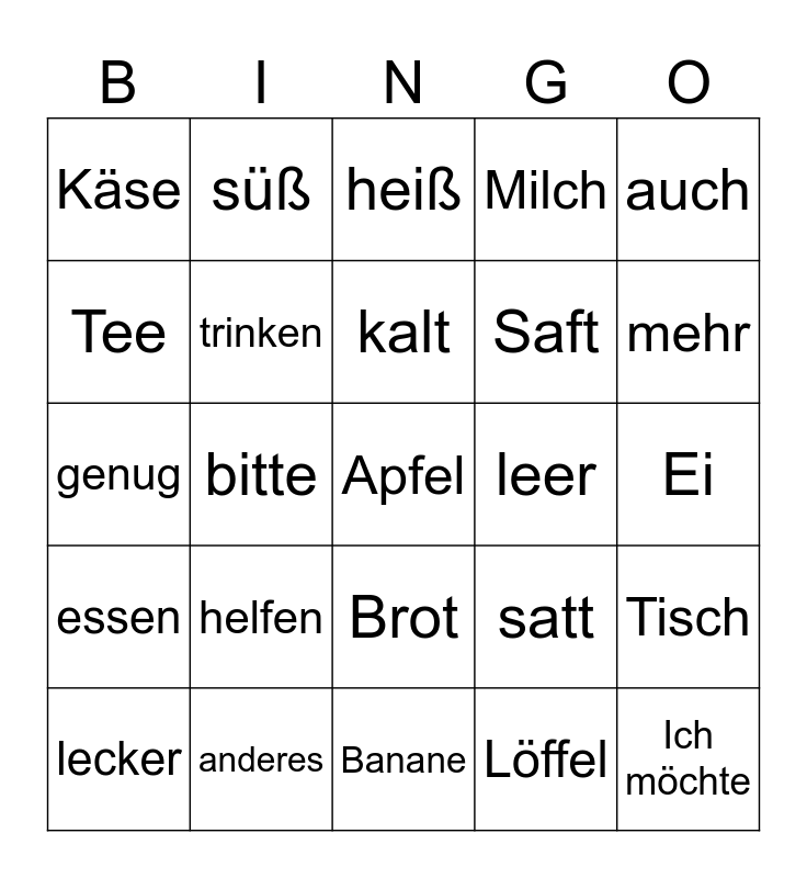 This bingo card has 33 words: Ich möchte, mit, bitte, nicht, essen, trinken, auch, lecker, süß, sauer, kalt, heiß, danke, wo, leer, mehr, anderes, genug, helfen, satt, Brot, Butter, Käse, Ei, Banane, Apfel, Milch, Saft, Tee, Tisch, Teller, Löffel and Guten Appetit!..