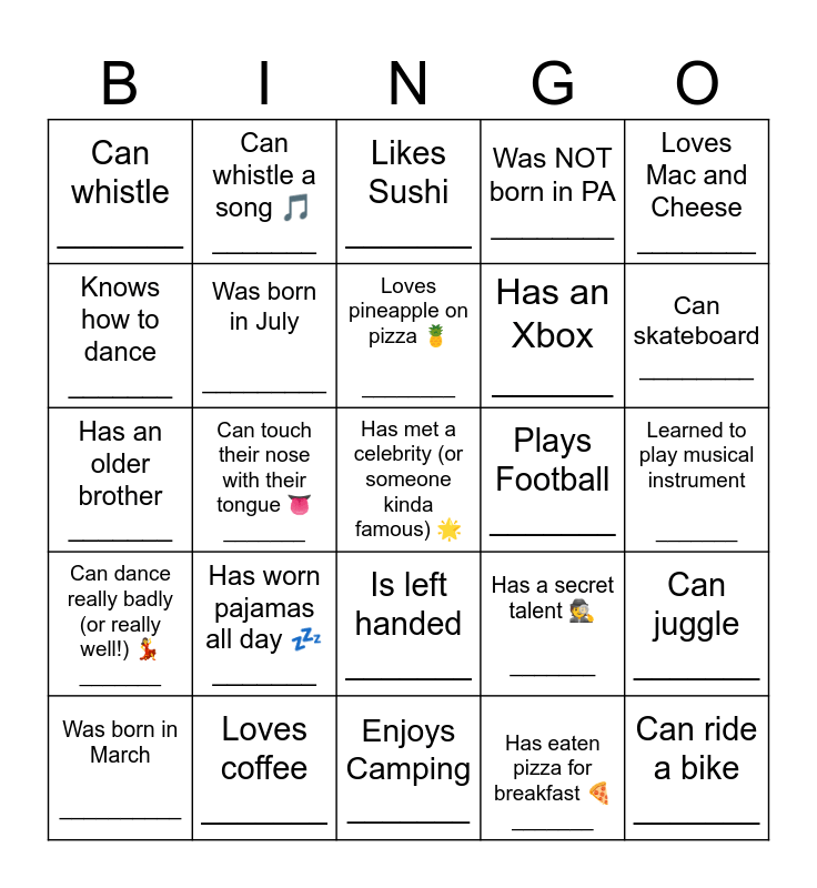 This bingo card has a free space and 32 words: Has eaten pizza for breakfast 🍕 _______, Is wearing jeans ________, Can touch their nose with their tongue 👅 _______, Has watched the same movie more than 5 times 🎬 _______, Can dance really badly (or really well!) 💃 _______, Was born in July _________, Loves Mac and Cheese ________, Can juggle _______, Can whistle a song 🎵 _______, Hates Pizza _______, Loves pineapple on pizza 🍍 ________, Likes Sushi _______, Has posted something embarrassing online 😳 ________, Can whistle _______, Plays Football _______, Can do a handstand or cartwheel 🤸 ________, Was born in March __________, Has an older brother _______, Is left handed _______, Has worn pajamas all day 💤 _______, Has a secret talent 🕵️ _______, Was on TV _______, Learned to play musical instrument _______, Loves coffee _______, Can ride a bike _______, Was NOT born in PA ________, Has an Xbox ______, Knows how to dance _______, Can whistle _______, Enjoys Camping _______, Has a nickname _______ and Can skateboard ________.