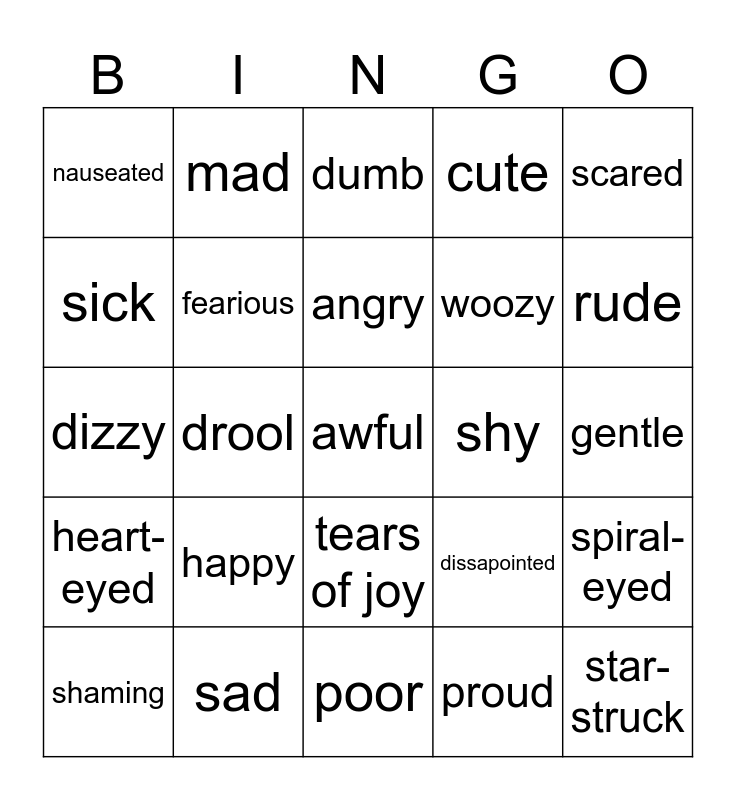 This bingo card has a free space and 24 words: happy, sad, angry, shaming, scared, nauseated, sick, mad, shy, tears of joy, woozy, dizzy, dissapointed, spiral- eyed, fearious, proud, gentle, dumb, rude, drool, star-struck, heart-eyed, cute and poor.