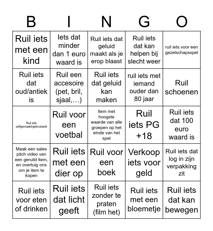 This bingo card has a free space and 24 words: Ruil iets met een dier op, Ruil iets dat licht geeft, Ruil iets dat geluid kan maken, Ruil iets voor eten of drinken, ruil iets voor een gezelschapsspel, Ruil iets met een kind, Ruil iets dat oud/antiek is, Iets dat minder dan 1 euro waard is, Ruil iets PG +18, Ruil voor een boek, ruil iets met iemand ouder dan 80 jaar, Ruil iets zelfgemaakt/geknutseld, Verkoop iets voor geld, Ruil iets dat log in zijn verpakking zit, Ruil een accesoire (pet, bril, sjaal,…), Ruil iets met een bloemetje, Ruil iets dat 100 euro waard is, Ruil iets dat geluid maakt als je erop blaast, Ruil schoenen, Ruil voor een voetbal, Ruil iets dat kan bewegen, Maak een sales pitch video van een geruild item, en overtuig ons om je item te kopen, Ruil iets dat kan helpen bij slecht weer and Ruil iets zonder te praten (film het).