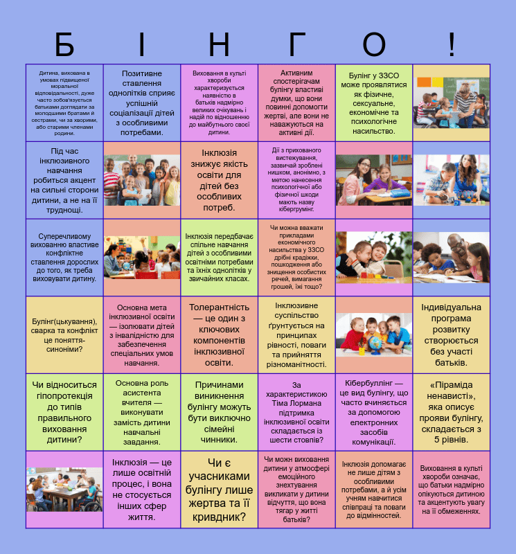 This bingo card has 9 images and 27 words: За характеристикою Тіма Лормана підтримка інклюзивної освіти складається із шести стовпів?, Причинами виникнення булінгу можуть бути виключно сімейні чинники., Чи можн виховання дитини у атмосфері емоційного знехтування викликати у дитини відчуття, що вона тягар у житті батьків?, Під час інклюзивного навчання робиться акцент на сильні сторони дитини, а не на її труднощі., Булінг(цькування), сварка та конфлікт це поняття-синоніми?, Чи можна вважати прикладами економічного насильства у ЗЗСО дрібні крадіжки, пошкодження або знищення особистих речей, вимагання грошей, їжі тощо?, Чи є учасниками булінгу лише жертва та її кривдник?, Булінг у ЗЗСО може проявлятися як фізичне, сексуальне, економічне та психологічне насильство., Кібербуллінг — це вид булінгу, що часто вчиняється за допомогою електронних засобів комунікації., Активним спостерігачам булінгу властиві думки, що вони повинні допомогти жертві, але вони не наважуються на активні дії., «Піраміда ненависті», яка описує прояви булінгу, складається з 5 рівнів., Дії з прихованого вистежування, зазвичай зроблені нишком, анонімно, з метою нанесення психологічної або фізичної шкоди мають назву кібергрумінг., Дитина, вихована в умовах підвищеної моральної відповідальності, дуже часто зобов'язується батьками доглядати за молодшими братами й сестрами, чи за хворими, або старими членами родини., Чи відноситься гіпопротекція до типів правильного виховання дитини?, Суперечливому вихованню властиве конфліктне ставлення дорослих до того, як треба виховувати дитину., Виховання в культі хвороби характеризується наявністю в батьків надмірно великих очікувань і надій по відношенню до майбутнього своєї дитини., Інклюзія передбачає спільне навчання дітей з особливими освітніми потребами та їхніх однолітків у звичайних класах., Основна мета інклюзивної освіти — ізолювати дітей з інвалідністю для забезпечення спеціальних умов навчання., Інклюзивне суспільство ґрунтується на принципах рівності, поваги та прийняття різноманітності., Толерантність — це один з ключових компонентів інклюзивної освіти., Позитивне ставлення однолітків сприяє успішній соціалізації дітей з особливими потребами., Інклюзія — це лише освітній процес, і вона не стосується інших сфер життя., Інклюзія знижує якість освіти для дітей без особливих потреб., Виховання в культі хвороби означає, що батьки надмірно опікуються дитиною та акцентують увагу на її обмеженнях., Індивідуальна програма розвитку створюється без участі батьків., Основна роль асистента вчителя — виконувати замість дитини навчальні завдання. and Інклюзія допомагає не лише дітям з особливими потребами, а й усім учням навчитися співпраці та поваги до відмінностей..