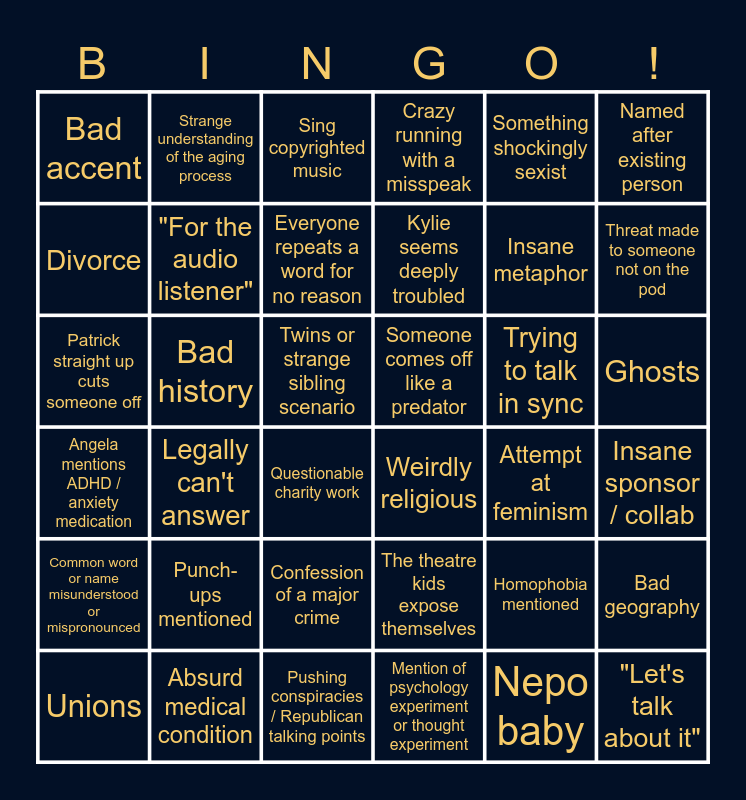 This bingo card has 36 words: The theatre kids expose themselves, Confession of a major crime, Mention of psychology experiment or thought experiment, Divorce, Angela mentions ADHD / anxiety medication, Someone comes off like a predator, "For the audio listener", Pushing conspiracies / Republican talking points, Something shockingly sexist, Homophobia mentioned, Threat made to someone not on the pod, Crazy running with a misspeak, Bad geography, Bad history, Kylie seems deeply troubled, Bad accent, Common word or name misunderstood or mispronounced, Trying to talk in sync, Patrick straight up cuts someone off, Sing copyrighted music, Twins or strange sibling scenario, Legally can't answer, Weirdly religious, Questionable charity work, Attempt at feminism, Strange understanding of the aging process, Insane metaphor, Absurd medical condition, Everyone repeats a word for no reason, Named after existing person, "Let's talk about it", Unions, Insane sponsor / collab, Ghosts, Punch-ups mentioned and Nepo baby.
