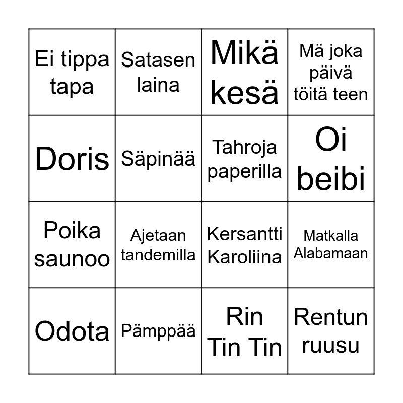 This bingo card has 70 words: Teuvo maanteiden kuningas, Rin Tin Tin, Dirlanda, Vuonna ’85, Kuuma kesä, Hengaillaan, Mä joka päivä töitä teen, Rusketusraidat, Doris, Tinakenkätyttö, Esson baariin, Vadelmavene, Ei tippa tapa, Mikä kesä, Muotitietoinen, Matkalla Alabamaan, Sata salamaa, Poika saunoo, Märkää, Rentun ruusu, Pämppää, Ryyppy, Ajetaan tandemilla, Ei oo, ei tuu, Peggy, Lastenlaulu, Sika, Nahkatakkinen tyttö, Taivas lyö tulta, Kaunis peto, Satasen laina, Daa-da daa-da, Mombasa, R-a-k-a-s, Varrella virran, Väinö, Marilyn, Asfalttiprinssi, Bensaa suonissa, Säpinää, Suuret setelit, Äidin pikkupoika, Odota, Kemiaa, Sinä lähdit pois, Tahroja paperilla, Juppihippipunkkari, Todella kaunis, Anna mulle piiskaa, Suomirokkia, Sokka irti, Tarkenee, Selvä päivä, Reggaerekka, Mökkitie, Mä haluun viihdyttää, Oi beibi, Kylmästä lämpimään, Hunningolla, Juodaan viinaa, Kersantti Karoliina, Pilke silmäkulmassa, Taiteilijaelämää, Pohjois-Karjala, Eesti (on my mind), Levoton Tuhkimo, Volga, Heilutaan, Pelimies and Maailma on sun.