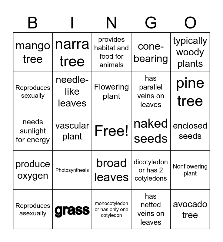 This bingo card has a free space and 24 words: Photosynthesis, grass, Flowering plant, Reproduces asexually, typically woody plants, mango tree, Reproduces sexually, narra tree, naked seeds, broad leaves, has parallel veins on leaves, needs sunlight for energy, dicotyledon or has 2 cotyledons, Nonflowering plant, needle-like leaves, has netted veins on leaves, enclosed seeds, provides habitat and food for animals, pine tree, vascular plant, avocado tree, produce oxygen, cone-bearing and monocotyledon or has only one cotyledon.