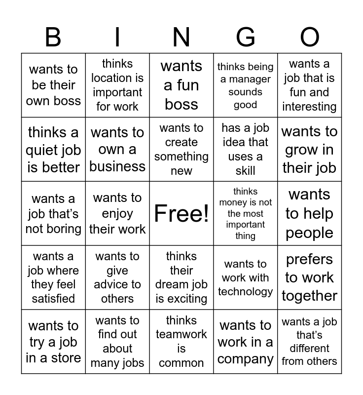This bingo card has a free space and 24 words: wants to give advice to others, wants to find out about many jobs, wants to create something new, wants to try a job in a store, wants a job that is fun and interesting, wants to be their own boss, thinks a quiet job is better, thinks location is important for work, thinks money is not the most important thing, thinks their dream job is exciting, has a job idea that uses a skill, wants a job that’s not boring, wants to work with technology, prefers to work together, wants to own a business, wants to work in a company, wants to help people, wants a fun boss, wants to grow in their job, wants to enjoy their work, wants a job that’s different from others, wants a job where they feel satisfied, thinks being a manager sounds good and thinks teamwork is common.