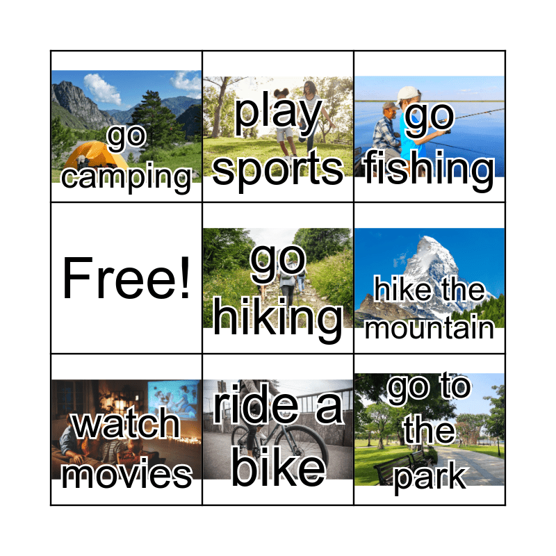 This bingo card has 9 images and 10 words: ride a bike, go fishing, go camping, go hiking, Free!, watch movies, play sports, go to lake, hike the mountain and go to the park.