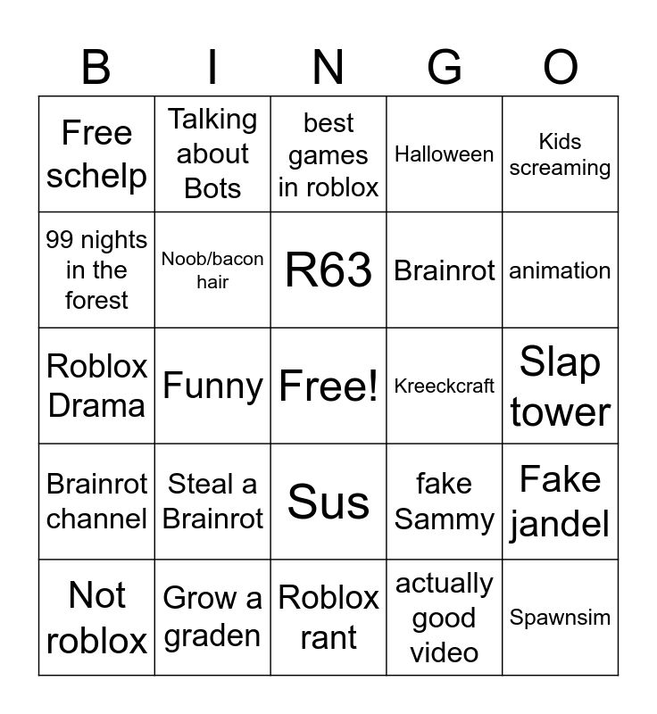 This bingo card has a free space and 24 words: Steal a Brainrot, Grow a graden, R63, Not roblox, Kids screaming, Free schelp, 99 nights in the forest, Talking about Bots, Kreeckcraft, Sus, Brainrot, Roblox Drama, fake Sammy, Fake jandel, Noob/bacon hair, actually good video, Slap tower, best games in roblox, animation, Funny, Spawnsim, Brainrot channel, Halloween and Roblox rant.