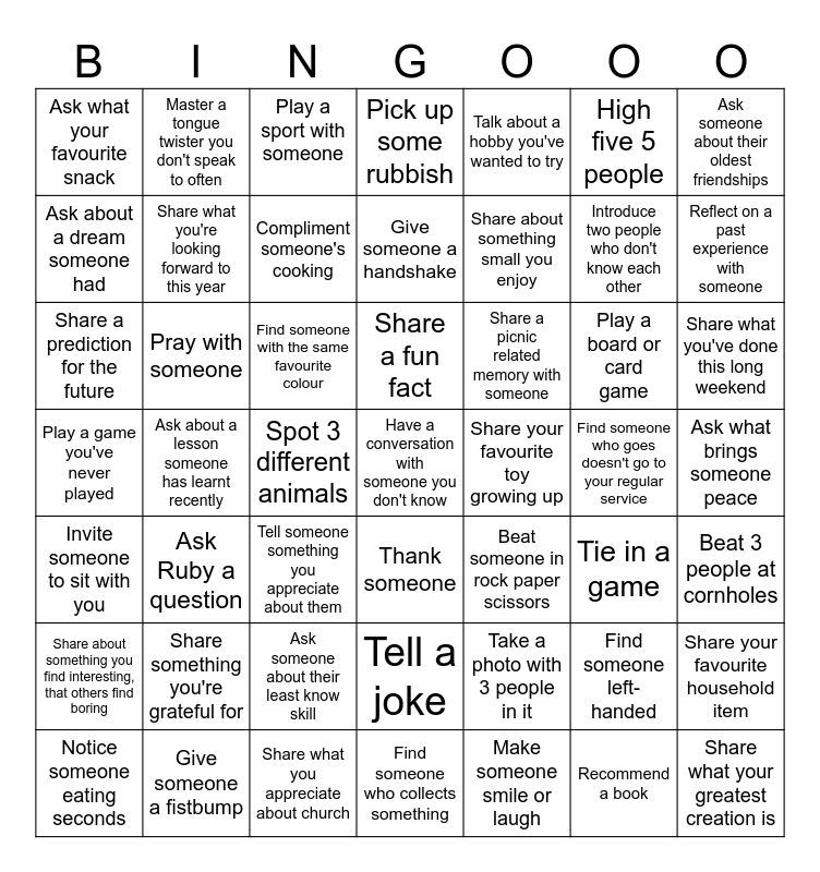 This bingo card has a free space and 48 words: Invite someone to sit with you, Ask about a lesson someone has learnt recently, Share what you appreciate about church, Thank someone, Share about something small you enjoy, Find someone who goes doesn't go to your regular service, Ask someone about their oldest friendships, Notice someone eating seconds, Pray with someone, Spot 3 different animals, Pick up some rubbish, Talk about a hobby you've wanted to try, Play a board or card game, Share what you've done this long weekend, Play a game you've never played, Share something you're grateful for, Play a sport with someone, Share a fun fact, Take a photo with 3 people in it, High five 5 people, Reflect on a past experience with someone, Ask about a dream someone had, Master a tongue twister you don't speak to often, Compliment someone's cooking, Make someone smile or laugh, Introduce two people who don't know each other, Ask what brings someone peace, Share about something you find interesting, that others find boring, Ask Ruby a question, Find someone with the same favourite colour, Tell a joke, Share a picnic related memory with someone, Find someone left-handed, Share your favourite household item, Ask what your favourite snack, Give someone a fistbump, Tell someone something you appreciate about them, Find someone who collects something, Share your favourite toy growing up, Recommend a book, Beat 3 people at cornholes, Share a prediction for the future, Share what you're looking forward to this year, Ask someone about their least know skill, Give someone a handshake, Beat someone in rock paper scissors, Tie in a game and Share what your greatest creation is.