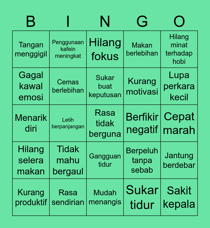 This bingo card has a free space and 24 words: Tidak mahu bergaul, Rasa sendirian, Sukar buat keputusan, Kurang produktif, Hilang minat terhadap hobi, Tangan menggigil, Gagal kawal emosi, Penggunaan kafein meningkat, Berfikir negatif, Gangguan tidur, Kurang motivasi, Menarik diri, Berpeluh tanpa sebab, Jantung berdebar, Cemas berlebihan, Sukar tidur, Cepat marah, Hilang fokus, Lupa perkara kecil, Letih berpanjangan, Sakit kepala, Hilang selera makan, Makan berlebihan and Mudah menangis.