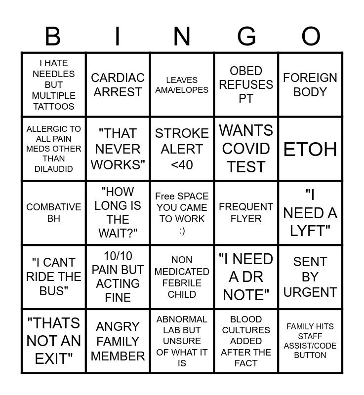 This bingo card has a free space and 44 words: ABD. PAIN/ VOMITING ASKS FOR FOOD AND DRINK, FAMILY HITS STAFF ASSIST/CODE BUTTON, "WEAK" 912, "THATS NOT AN EXIT", WANTS A PREGANCY TEST, BLOOD CULTURES ADDED AFTER THE FACT, LEAVES AMA/ELOPES, CT BLOWS LINE, FOREIGN BODY, ANGRY FAMILY MEMBER, OBED REFUSES PT, FREQUENT FLYER, NON MEDICATED FEBRILE CHILD, 10/10 PAIN BUT ACTING FINE, RADIOLOGY DOESNT NOTIFY PT IS BACK, ABNORMAL LAB BUT UNSURE OF WHAT IT IS, "ITS IN MY CHART", COMBATIVE BH, LEGAL DRAW, ETOH, CARDIAC ARREST, SPICY MED CLEARENCE, STD EXPOSURE, I HATE NEEDLES BUT MULTIPLE TATTOOS, FALL ON BLOOD THINNER, "I NEED A LYFT", TOO DRUNK FOR JAIL, NURSING HOME SEND "ALTERED MENTAL STATUS" HX OF DEMENTIA, "I NEED A DR NOTE", "I CANT RIDE THE BUS", CALL LIGHT PRESSED 5 MINUTES INTO ROOM, SENT BY URGENT, HOME MEDS IN WALMART BAG, PT FAMILY ARRIVES WITH BADGE, "HOW LONG IS THE WAIT?", OTHER COUNTY EMS BRINGS A STABLE PT TO THIS ER, CHECKS IN WITH HYPERTENSION WITH WDL BP, CODE BROWN, STROKE ALERT <40, ALLERGIC TO ALL PAIN MEDS OTHER THAN DILAUDID, WANTS COVID TEST, "I DIDNT KNOW I WAS GETTING A PT" OR "IN A ROOM", "THAT NEVER WORKS" and THEY ALWAYS CALL IV TEAM.