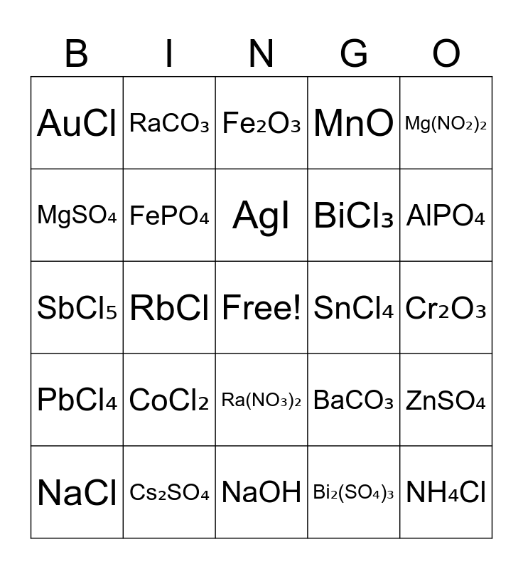 This bingo card has a free space and 150 words: CsOH, Cd(NO₃)₂, Pt(NO₃)₂, Ni(NO₃)₂, K₃PO₄, BaCl₂, CoCl₃, Co(NO₃)₂, Mg₃(PO₄)₂, RbOH, AgCl, Rb₂SO₄, BiCl₃, AgNO₃, FePO₄, Co₂O₃, BeCl₂, Ca(NO₃)₂, NH₄NO₂, FrNO₃, SrCO₃, CsBr, BiBr₃, Cr₂(SO₄)₃, PtCl₂, NH₄OH, Fe(NO₃)₃, SnCl₄, CuSO₄, NaHCO₃, Bi₂(SO₄)₃, Sb₂O₃, CaF₂, PtCl₄, FrBr, Cu(NO₃)₂, PbO, MnSO₄, NH₄Cl, Cu₃(PO₄)₂, CdSO₄, Cr(NO₃)₃, Mg(NO₂)₂, KClO₃, Li₂CO₃, CoSO₄, Pt(NO₃)₄, Sn(NO₃)₂, PbCl₄, SrCl₂, NiO, Ra(NO₃)₂, SbCl₅, Ca₃(PO₄)₂, ZnCl₂, NH₄Br, Ni₃(PO₄)₂, SnO, ZnO, CaSO₄, Pb(NO₃)₂, CoCl₂, MgSO₄, PbCl₂, AuCl₃, MnO, RaCO₃, MgO, Zn(NO₃)₂, NaOH, BaCO₃, Al(ClO₃)₃, FeCl₃, CdS, Mn(NO₃)₂, KNO₃, SbCl₃, FeSO₄, AgI, Sr(NO₃)₂, CuCl, PbO₂, CdO, Bi(NO₃)₃, Cr₂O₃, AuBr₃, Cu₂O, CrCl₃, Sb(NO₃)₃, Ra(OH)₂, Au(NO₃)₃, Al₂O₃, NH₄NO₃, PtO₂, BCl₃, CrCl₂, CsCl, Ag₂CO₃, Sr(OH)₂, Fr₂SO₄, Fe₂(SO₄)₃, Na₃PO₄, RaCl₂, AlPO₄, Mg(OH)₂, Sb₂O₅, FrOH, RbBr, SnO₂, SrSO₄, BaSO₄, Li₂S, AlPO₄, Ca(OH)₂, Au₂O₃, Mg(ClO₃)₂, Ni₂O₃, Fe₂O₃, NH₄ClO₃, Zn₃(PO₄)₂, SnCl₂, CdCl₂, KOH, AuCl, Cs₂SO₄, CuO, ZnSO₄, RbCl, FeCl₂, RaSO₄, CsNO₃, NiCl₂, Ba(OH)₂, FrCl, Bi₂O₃, NH₄CO₃, RbNO₃, NaCl, MnO₂, K₂SO₄, MnCl₂, AgBr, Ca(ClO₃)₂, Ba(NO₃)₂, NaNO₂, Co₃(PO₄)₂, NaClO₃, CuCl₂, KBr and NiSO₄.