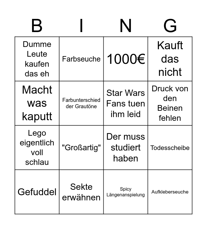 This bingo card has 16 words: Sekte erwähnen, Todesscheibe, 1000€, Dumme Leute kaufen das eh, Lego eigentlich voll schlau, Farbseuche, Der muss studiert haben, Spicy Längenanspielung, Macht was kaputt, Farbunterschied der Grautöne, Gefuddel, Kauft das nicht, "Großartig", Druck von den Beinen fehlen, Star Wars Fans tuen ihm leid and Aufkleberseuche.