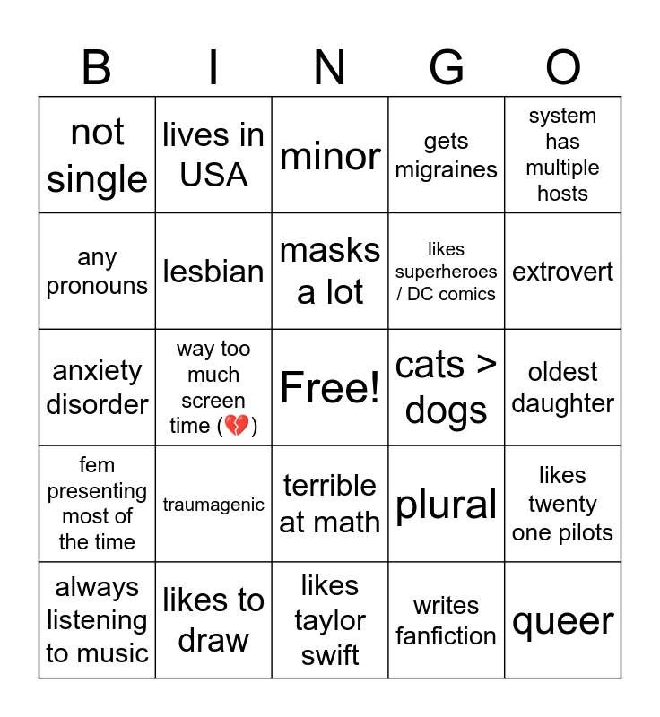 This bingo card has a free space and 24 words: always listening to music, traumagenic, masks a lot, writes fanfiction, system has multiple hosts, not single, lives in USA, minor, cats > dogs, oldest daughter, anxiety disorder, lesbian, plural, likes twenty one pilots, any pronouns, likes to draw, likes taylor swift, gets migraines, extrovert, fem presenting most of the time, way too much screen time (💔), terrible at math, likes superheroes / DC comics and queer.