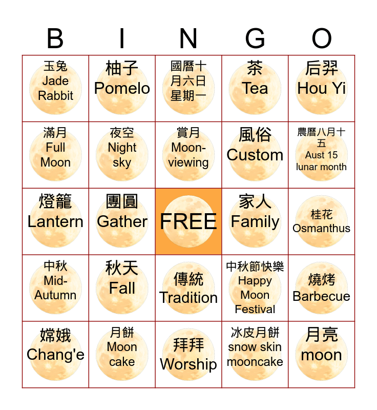 This bingo card has 24 images, a free space and 24 words: 秋天 Fall, 月餅 Moon cake, 賞月 Moon-viewing, 嫦娥 Chang'e, 后羿 Hou Yi, 玉兔 Jade Rabbit, 滿月 Full Moon, 柚子 Pomelo, 家人 Family, 傳統Tradition, 風俗 Custom, 燈籠 Lantern, 中秋節快樂 Happy Moon Festival, 燒烤Barbecue, 夜空 Night sky, 冰皮月餅 snow skin mooncake, 桂花 Osmanthus, 國曆十月六日 星期一, 農曆八月十五 Aust 15 lunar month, 團圓 Gather, 月亮 moon, 中秋 Mid-Autumn, 茶 Tea and 拜拜 Worship.