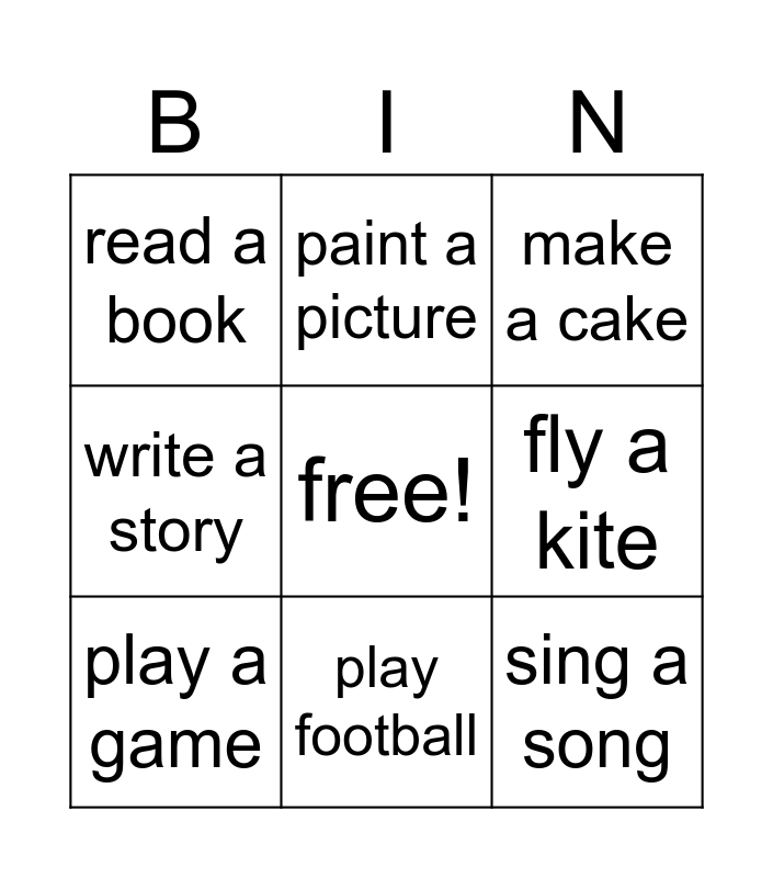 This bingo card has a free space and 8 words: fly a kite, make a cake, paint a picture, play a game, read a book, sing a song, write a story and play football.