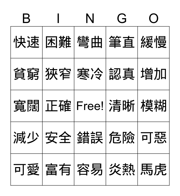 This bingo card has a free space and 24 words: 可愛, 安全, 寒冷, 炎熱, 緩慢, 快速, 困難, 彎曲, 清晰, 模糊, 寬闊, 狹窄, 危險, 可惡, 貧窮, 富有, 容易, 筆直, 增加, 減少, 正確, 錯誤, 認真 and 馬虎.