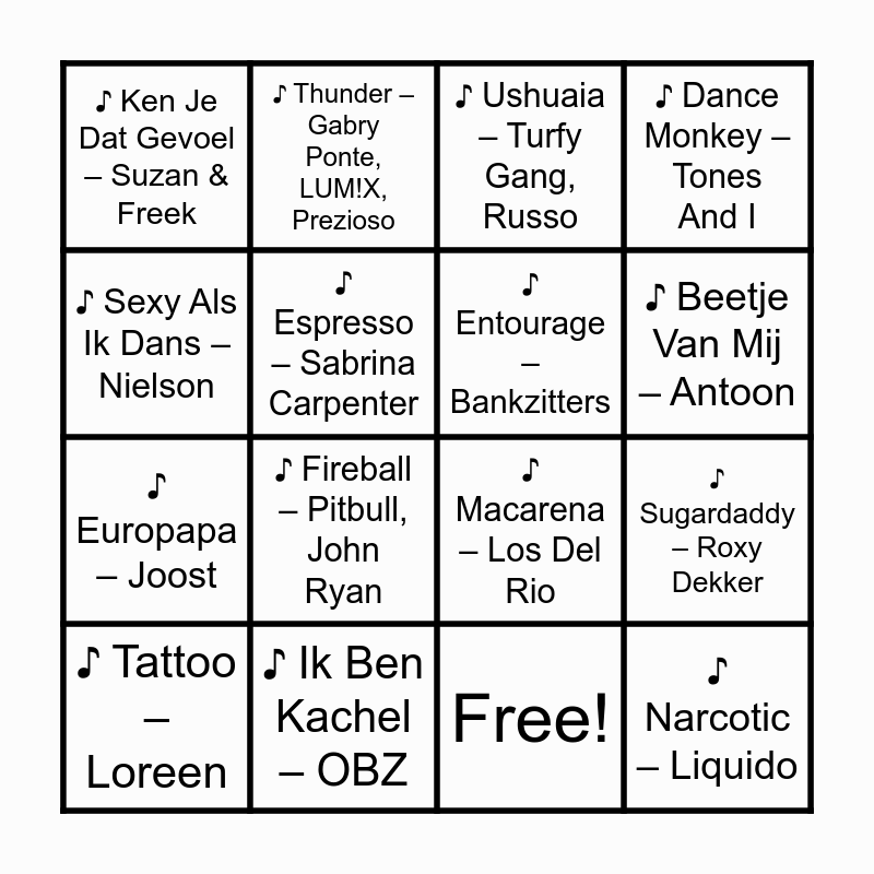 This bingo card has 17 words: Free!, ♪ Tattoo – Loreen, ♪ Ushuaia – Turfy Gang, Russo, ♪ Ken Je Dat Gevoel – Suzan & Freek, ♪ Fireball – Pitbull, John Ryan, ♪ Dance Monkey – Tones And I, ♪ Sugardaddy – Roxy Dekker, ♪ Entourage – Bankzitters, ♪ Beetje Van Mij – Antoon, ♪ Espresso – Sabrina Carpenter, ♪ Ik Ben Kachel – OBZ, ♪ Macarena – Los Del Rio, ♪ Sexy Als Ik Dans – Nielson, ♪ Thunder – Gabry Ponte, LUM!X, Prezioso, ♪ Europapa – Joost, ♪ APT. – ROSÉ, Bruno Mars and ♪ Narcotic – Liquido.