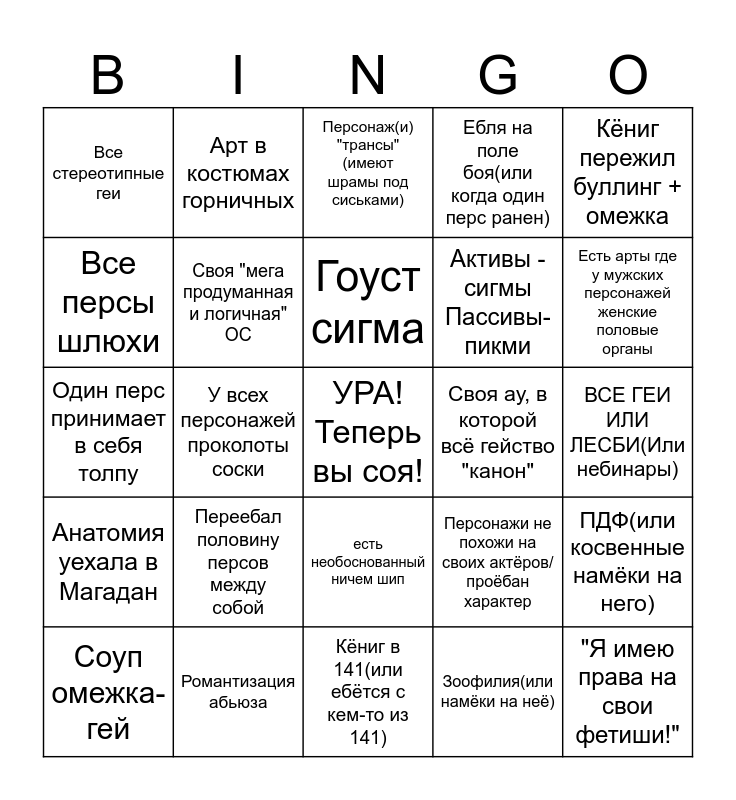 This bingo card has a free space and 24 words: Переебал половину персов между собой, Романтизация абьюза, Гоуст сигма, Соуп омежка-гей, Кёниг пережил буллинг + омежка, Все стереотипные геи, Все персы шлюхи, Арт в костюмах горничных, Своя ау, в которой всё гейство "канон", есть необоснованный ничем шип, Активы - сигмы Пассивы- пикми, Один перс принимает в себя толпу, Персонажи не похожи на своих актёров/проёбан характер, ПДФ(или косвенные намёки на него), Своя "мега продуманная и логичная" ОС, Зоофилия(или намёки на неё), ВСЕ ГЕИ ИЛИ ЛЕСБИ(Или небинары), Персонаж(и) "трансы" (имеют шрамы под сиськами), Есть арты где у мужских персонажей женские половые органы, У всех персонажей проколоты соски, "Я имею права на свои фетиши!", Анатомия уехала в Магадан, Ебля на поле боя(или когда один перс ранен) and Кёниг в 141(или ебётся с кем-то из 141).