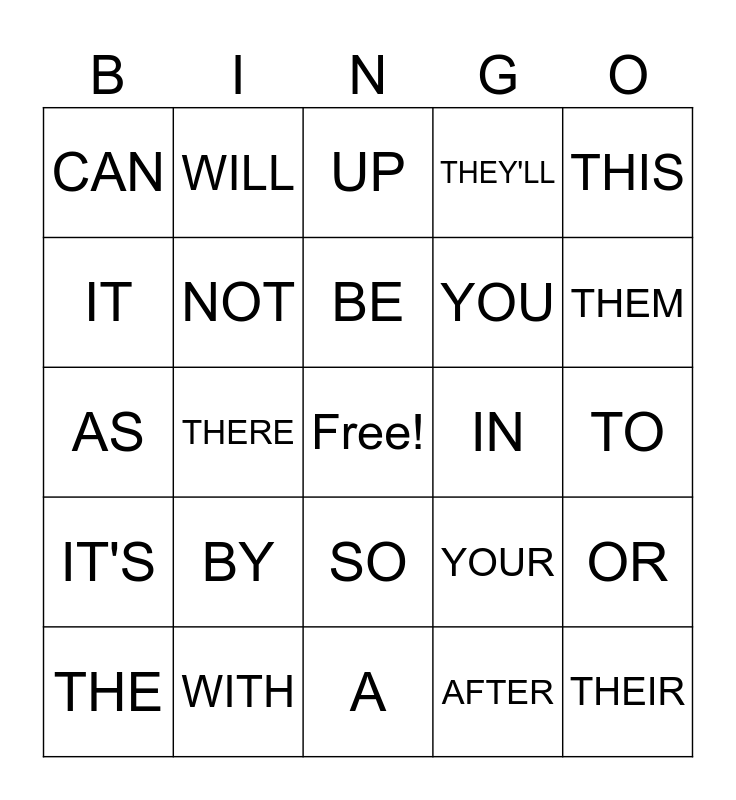 This bingo card has a free space and 25 words: BY, A, BE, THE, THIS, CAN, IT, WILL, IN, SO, YOU, AS, YOUR, OR, NOT, OF, TO, UP, THEM, THERE, THEIR, WITH, IT'S, THEY'LL and AFTER.