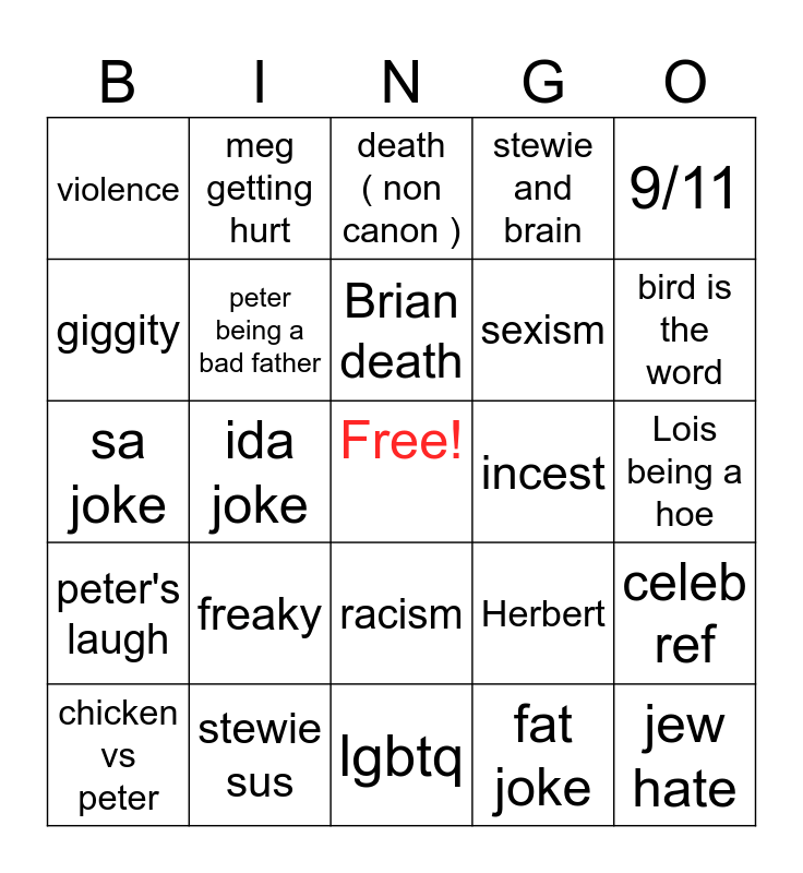 This bingo card has a free space and 24 words: freaky, stewie sus, Brian death, chicken vs peter, 9/11, violence, giggity, meg getting hurt, incest, racism, sexism, sa joke, Herbert, celeb ref, peter being a bad father, fat joke, Lois being a hoe, death ( non canon ), bird is the word, ida joke, jew hate, peter's laugh, stewie and brain and lgbtq.