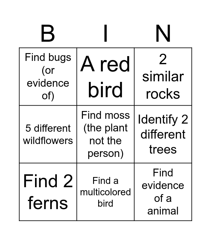 This bingo card has a free space and 8 words: Identify 2 different trees, 2 similar rocks, A red bird, Find 2 ferns, Find bugs (or evidence of), Find evidence of a animal, 5 different wildflowers and Find a multicolored bird.