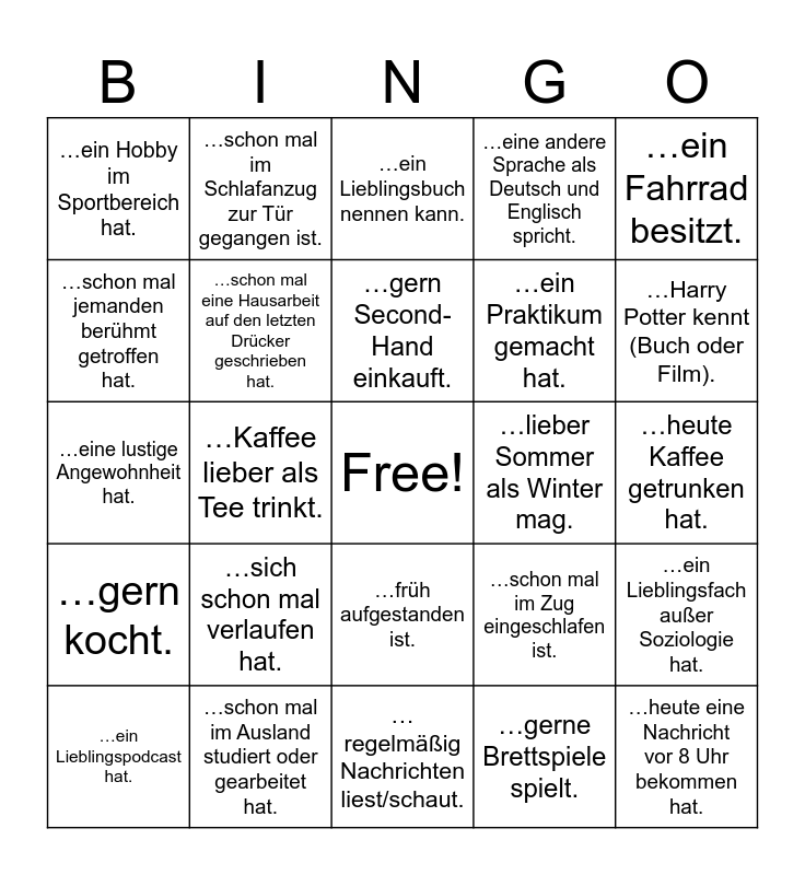 This bingo card has a free space and 70 words: …schon mal in Berlin war., …heute Kaffee getrunken hat., …gerne Serien schaut., …ein Haustier hat oder hatte., …schon mal im Ausland studiert oder gearbeitet hat., …ein Instrument spielen kann., …eine andere Sprache als Deutsch und Englisch spricht., …gerne Pizza isst., …ein Fahrrad besitzt., …heute zu Fuß zur Uni gekommen ist., …ein Lieblingsfach außer Soziologie hat., …gerne tanzt., …ein Hobby im Sportbereich hat., …ein Lieblingsbuch nennen kann., …schon mal auf einem Festival war., …Kaffee lieber als Tee trinkt., …früh aufgestanden ist., …ein Praktikum gemacht hat., …kein Instagram hat., …gern kocht., …lieber Sommer als Winter mag., …schon mal im Zug eingeschlafen ist., …Harry Potter kennt (Buch oder Film)., …Vegetarier*in oder Veganer*in ist., …schon mal beim Karaoke gesungen hat., …in einer WG wohnt., …lieber süß statt salzig isst., …schon mal ein Ehrenamt gemacht hat., …gerne Brettspiele spielt., …einen lustigen Fun Fact über sich erzählen kann., …schon mal im Schlafanzug zur Tür gegangen ist., …heute früh gefrühstückt hat., …gerne Hip-Hop hört., …ein Lieblingszitat hat., …schon mal gecampt hat., …kein Netflix-Abo hat., …einen Spitznamen hat., …gerne ins Kino geht., …heute Wasser bei sich hat., …schon mal jemanden berühmt getroffen hat., …lieber Nachtmensch als Frühaufsteher ist., …sich schon mal verlaufen hat., …heute eine Nachricht vor 8 Uhr bekommen hat., …ein Lieblingsgetränk mit Koffein hat., …ein Lieblingsmuseum nennen kann., …schon mal eine Hausarbeit auf den letzten Drücker geschrieben hat., …ein Lieblingspodcast hat., …lieber Berge als Meer mag., …gerne Fotos macht., …schon mal Sushi gegessen hat., …eine Pflanze im Zimmer hat., …schon mal beim Sport verletzt war., …etwas Süßes in der Tasche hat., …schon mal einen Nachtzug genommen hat., …regelmäßig Nachrichten liest/schaut., …sich schon mal ein komplettes Wochenende durchgesuchtet hat., …gern Second-Hand einkauft., …einen Lieblingspodcast oder YT-Kanal hat., …gerne lange schläft., …schon mal Karaoke gemacht hat (freiwillig oder gezwungen 😅)., …eine lustige Angewohnheit hat., …schon mal ein Haustier nach einer berühmten Figur benannt hat., …gerne auf Flohmärkte geht., …schon mal etwas gesammelt hat (Sticker, Münzen, Karten…)., …ein Lieblingsfach aus der Schulzeit nennen kann., …schon mal über 12 Stunden wachgeblieben ist., …einen Lieblings-Comedian hat., …lieber Bahn statt Auto fährt., …schon mal bei einem Protest oder einer Demo dabei war. and …gerne im Regen spazieren geht..
