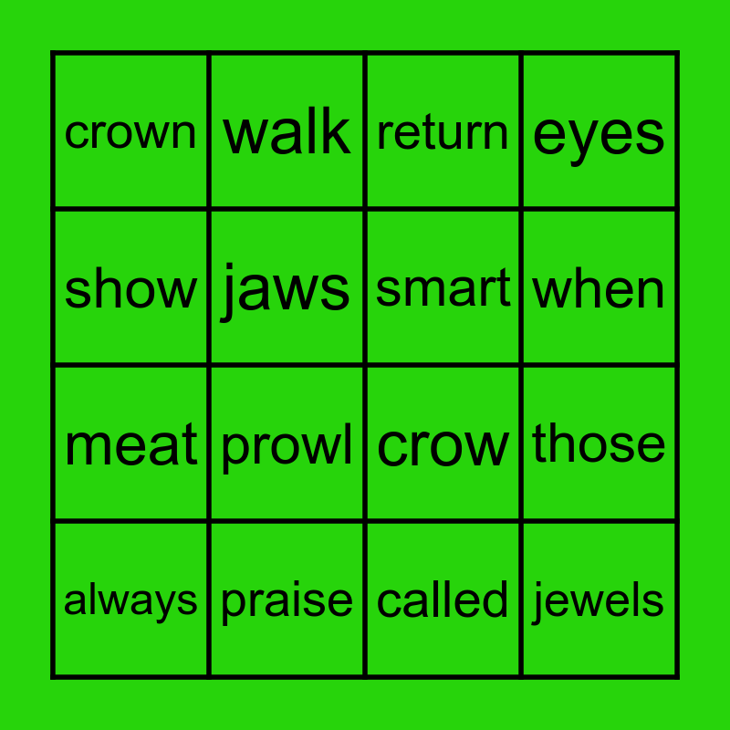 This bingo card has 19 words: crow, birds, return, jewels, those, show, called, crown, walk, meat, prowl, jaws, smart, praise, always, today, eyes, when and said.