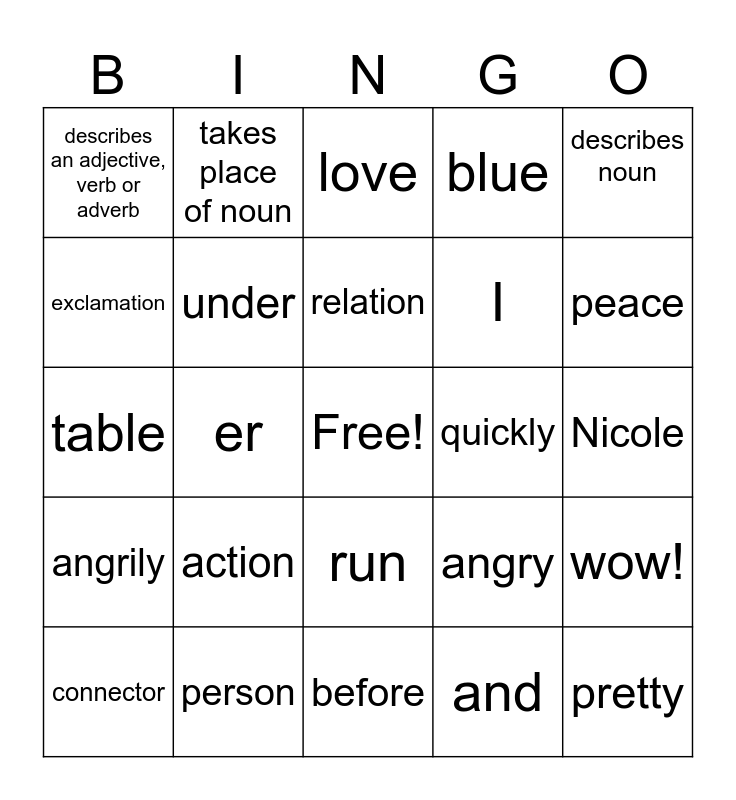 This bingo card has a free space and 24 words: action, person, relation, connector, describes noun, describes an adjective, verb or adverb, exclamation, takes place of noun, quickly, run, I, table, angry, wow!, under, and, Nicole, love, peace, er, pretty, angrily, blue and before.