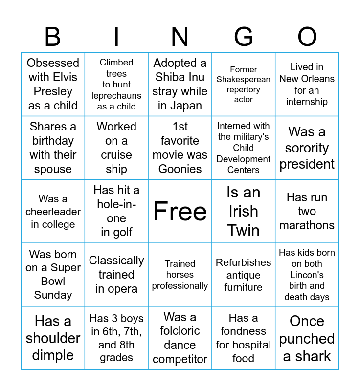 This bingo card has a free space and 24 words: Classically trained in opera, Has 3 boys in 6th, 7th, and 8th grades, 1st favorite movie was Goonies, Has a shoulder dimple, Lived in New Orleans for an internship, Obsessed with Elvis Presley as a child, Shares a birthday with their spouse, Climbed trees to hunt leprechauns as a child, Is an Irish Twin, Trained horses professionally, Interned with the military's Child Development Centers, Was a cheerleader in college, Refurbishes antique furniture, Has kids born on both Lincon's birth and death days, Worked on a cruise ship, Has a fondness for hospital food, Has run two marathons, Adopted a Shiba Inu stray while in Japan, Was a sorority president, Has hit a hole-in-one in golf, Once punched a shark, Was born on a Super Bowl Sunday, Former Shakesperean repertory actor and Was a folcloric dance competitor.