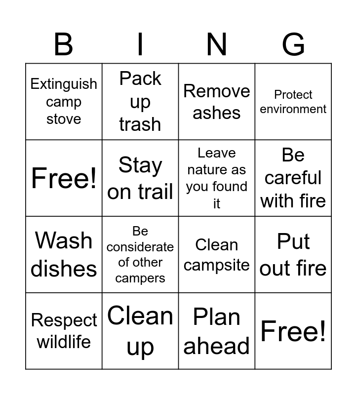 This bingo card has 16 words: Clean up, Put out fire, Remove ashes, Extinguish camp stove, Wash dishes, Pack up trash, Clean campsite, Plan ahead, Free!, Stay on trail, Respect wildlife, Protect environment, Be considerate of other campers, Be careful with fire, Leave nature as you found it and Free!.