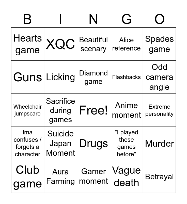 This bingo card has a free space and 24 words: Suicide Japan Moment, Aura Farming, Diamond game, Club game, Spades game, Hearts game, Guns, XQC, Anime moment, Drugs, Flashbacks, Wheelchair jumpscare, "I played these games before", Murder, Licking, Vague death, Extreme personality, Beautiful scenary, Odd camera angle, Sacrifice during games, Betrayal, Ima confuses / forgets a character, Alice reference and Gamer moment.