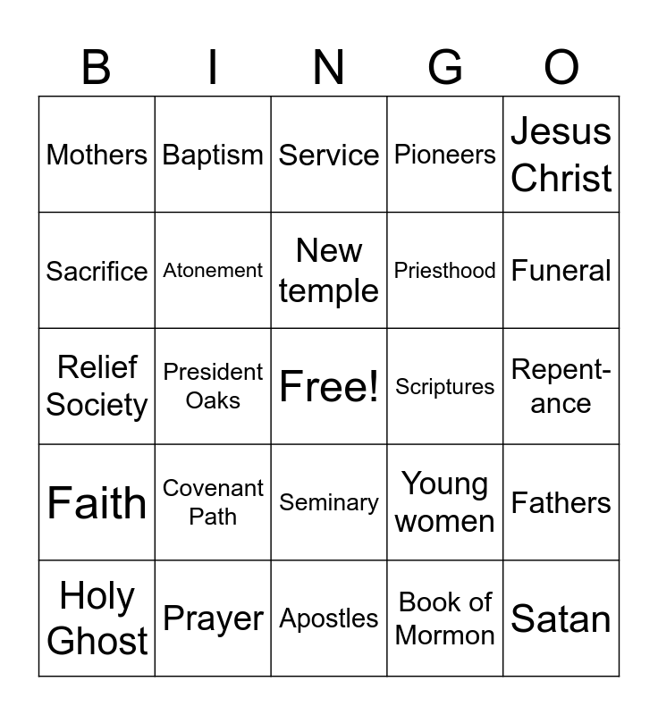 This bingo card has a free space and 24 words: Covenant Path, Prayer, New temple, Holy Ghost, Jesus Christ, Mothers, Sacrifice, Baptism, Scriptures, Seminary, Priesthood, Relief Society, Young women, Fathers, Atonement, Book of Mormon, Repent-ance, Service, Funeral, President Oaks, Satan, Faith, Pioneers and Apostles.