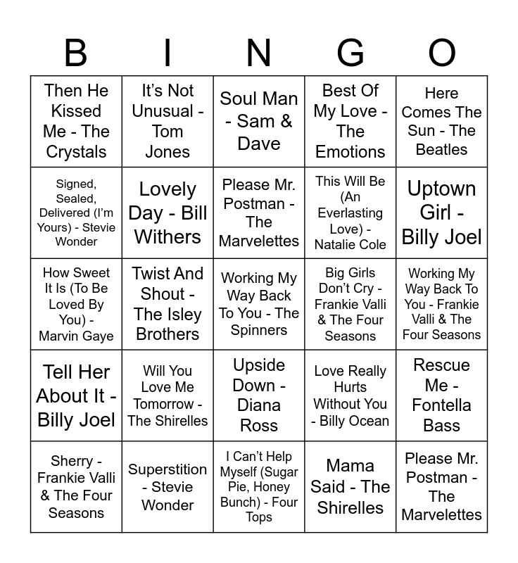 This bingo card has 40 words: Free!, How Sweet It Is (To Be Loved By You) - Marvin Gaye, Mr. Big Stuff - Jean Knight, Lovely Day - Bill Withers, Superstition - Stevie Wonder, Upside Down - Diana Ross, Please Mr. Postman - The Marvelettes, I Want To Hold Your Hand - The Beatles, Here Comes The Sun - The Beatles, Tell Her About It - Billy Joel, Twist And Shout - The Isley Brothers, Best Of My Love - The Emotions, Working My Way Back To You - The Spinners, Working My Way Back To You - Frankie Valli & The Four Seasons, Big Girls Don’t Cry - Frankie Valli & The Four Seasons, Will You Love Me Tomorrow - The Shirelles, Do You Believe In Magic? - The Lovin’ Spoonful, Then He Kissed Me - The Crystals, My Guy - Mary Wells, Soul Man - Sam & Dave, Rescue Me - Fontella Bass, Mama Said - The Shirelles, This Will Be (An Everlasting Love) - Natalie Cole, Signed, Sealed, Delivered (I’m Yours) - Stevie Wonder, Suspicious Minds - Elvis Presley, Baby Love - The Supremes, I Say A Little Prayer - Aretha Franklin, (Your Love Keeps Lifting Me) Higher and Higher - Jackie Wilson, Please Mr. Postman - The Marvelettes, God Only Knows - The Beach Boys, Stop! In The Name Of Love - The Supremes, Sherry - Frankie Valli & The Four Seasons, Build Me Up Buttercup - The Foundations, Love Really Hurts Without You - Billy Ocean, Uptown Girl - Billy Joel, I Can’t Help Myself (Sugar Pie, Honey Bunch) - Four Tops, Don’t Go Breaking My Heart - Elton John, For Once In My Life - Stevie Wonder, It’s Not Unusual - Tom Jones and You Can’t Hurry Love - The Supremes.